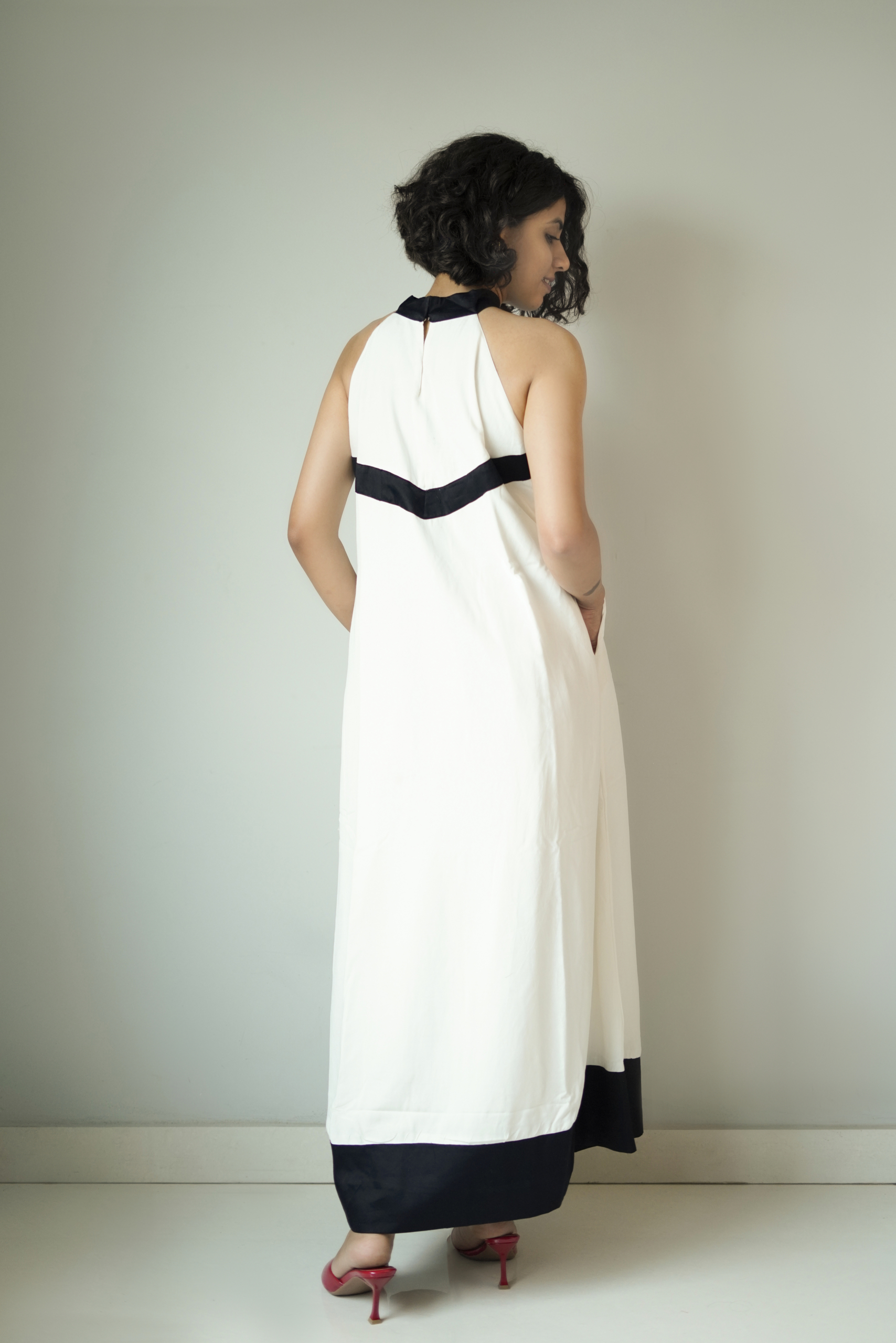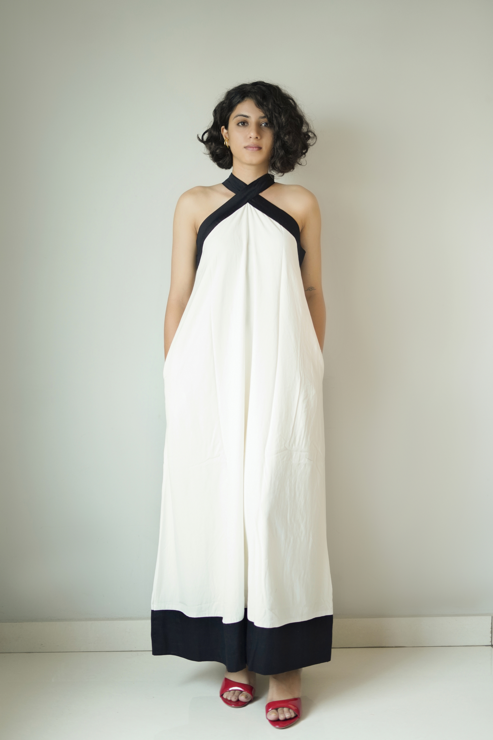 Effortlessly elegant with a modern edge, the Black Tie Breeze Dress is a timeless monochrome statement. Designed with a striking halter neckline featuring bold black contrast ties, this dress flows into a soft ivory silhouette that moves beautifully with every step. The subtle black hem detail grounds the look, creating a perfect balance of drama and minimalism.