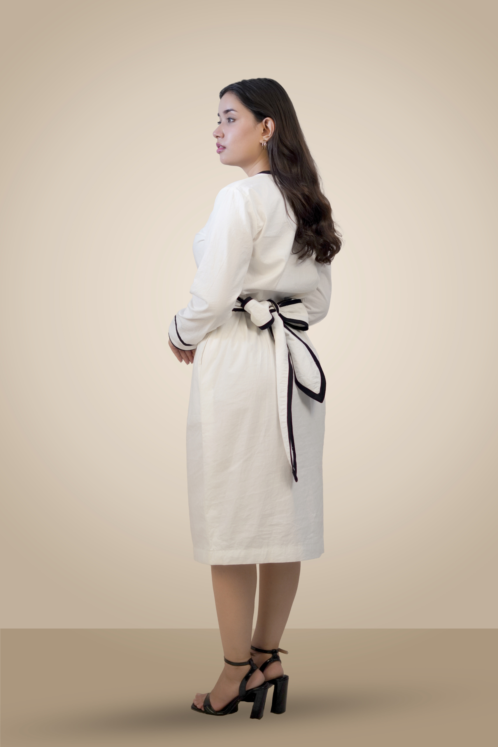 The Classic Statement Midi is a timeless blend of refined elegance and modern structure, designed for those who appreciate subtle detail with lasting impact. Crafted in a soft ivory tone, this midi dress is elevated by bold contrast accents that frame the silhouette beautifully, lending a polished and intentional finish.