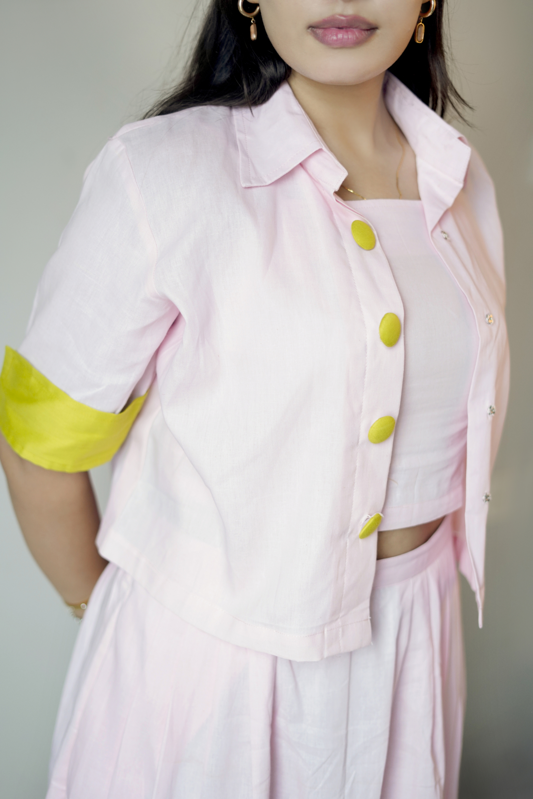 Bright, breezy, and beautifully layered — the Pastel Pop 3-Piece Set is designed to bring effortless elegance to everyday dressing. This coordinated trio includes a structured sleeveless crop top, a flowy high-waist skirt, and a relaxed open jacket, all in a soft pastel pink that feels light and feminine.