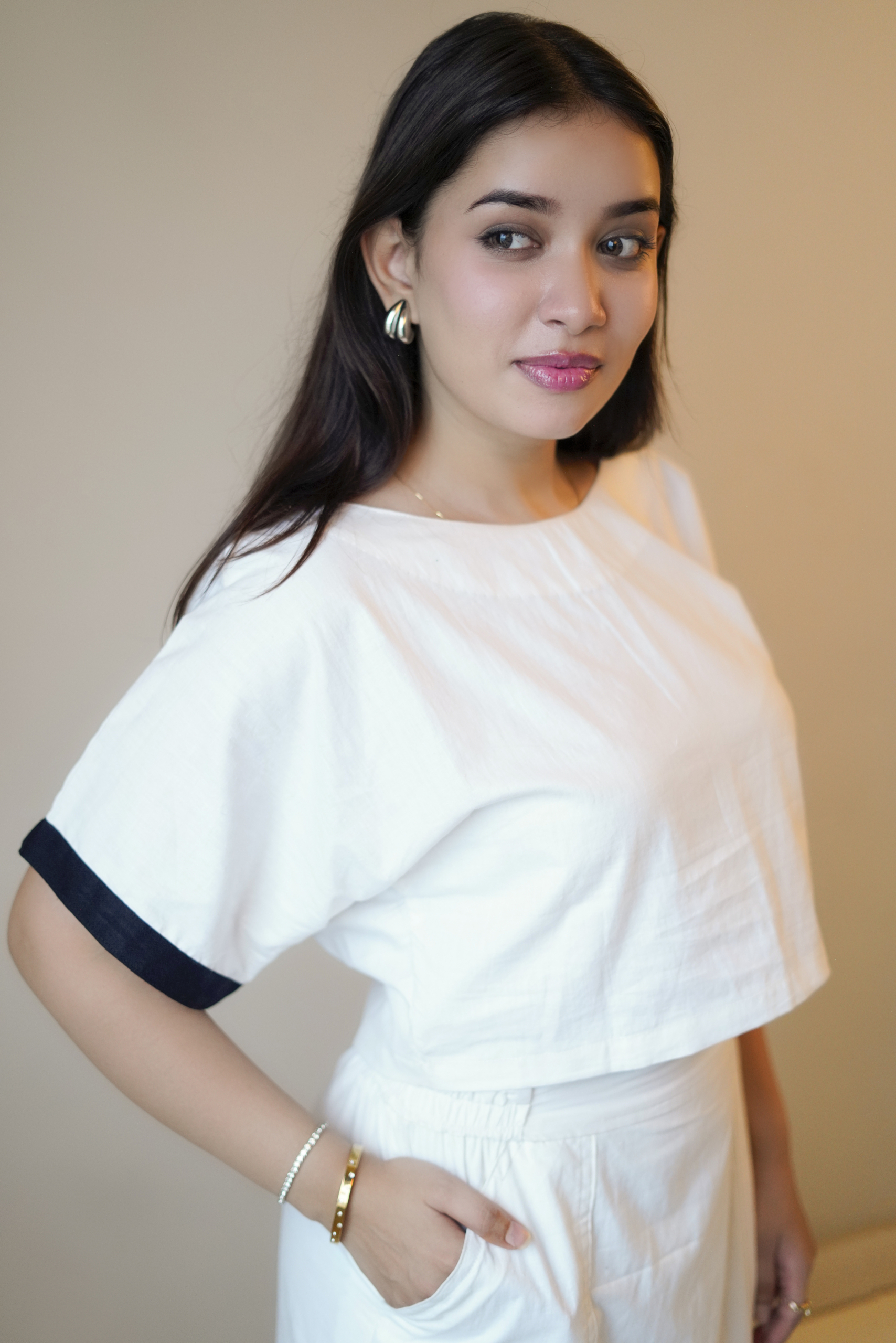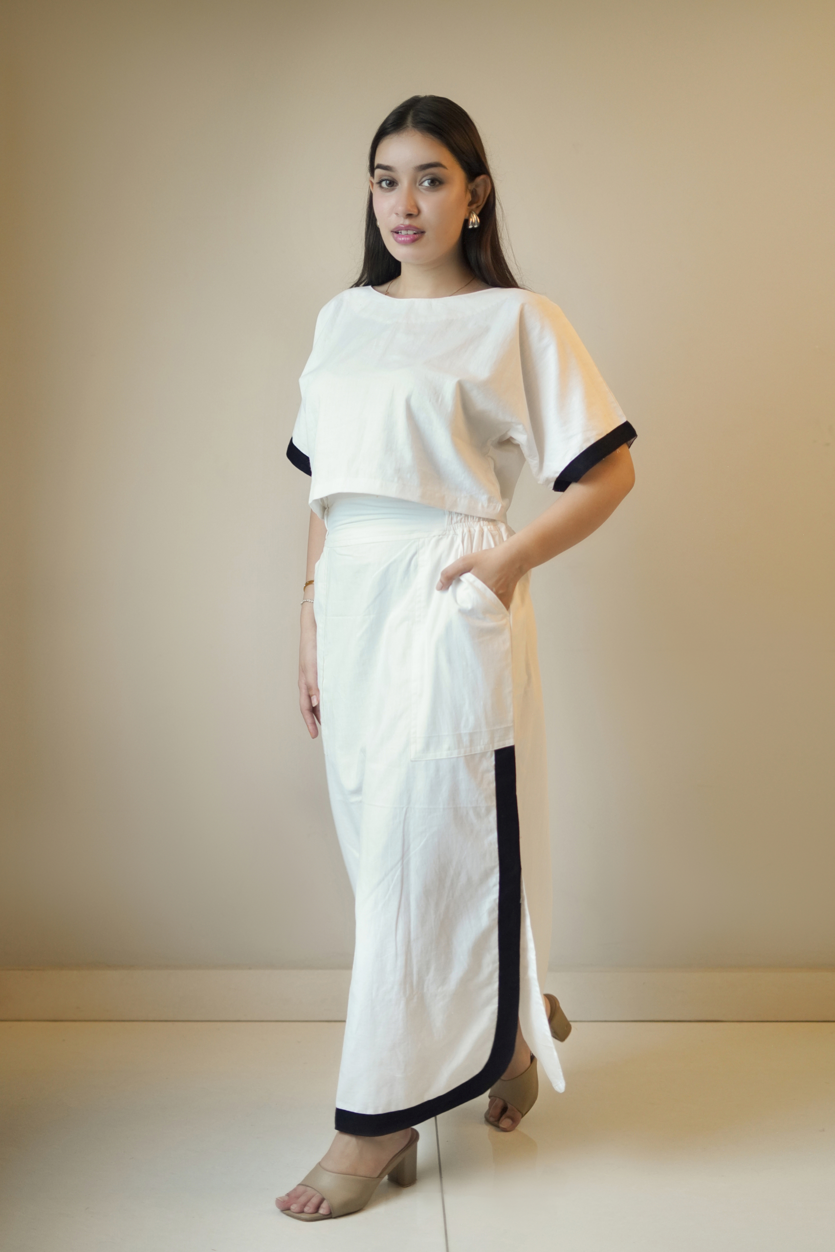 Refined, minimal, and quietly powerful, the Silent Statement Co-ord is designed for those who let clean lines speak louder than trends. This monochrome two-piece set features a relaxed ivory crop top with a soft round neckline and subtle black edging on the sleeves, paired with a high-waisted straight skirt detailed with a bold black border that frames the silhouette beautifully.