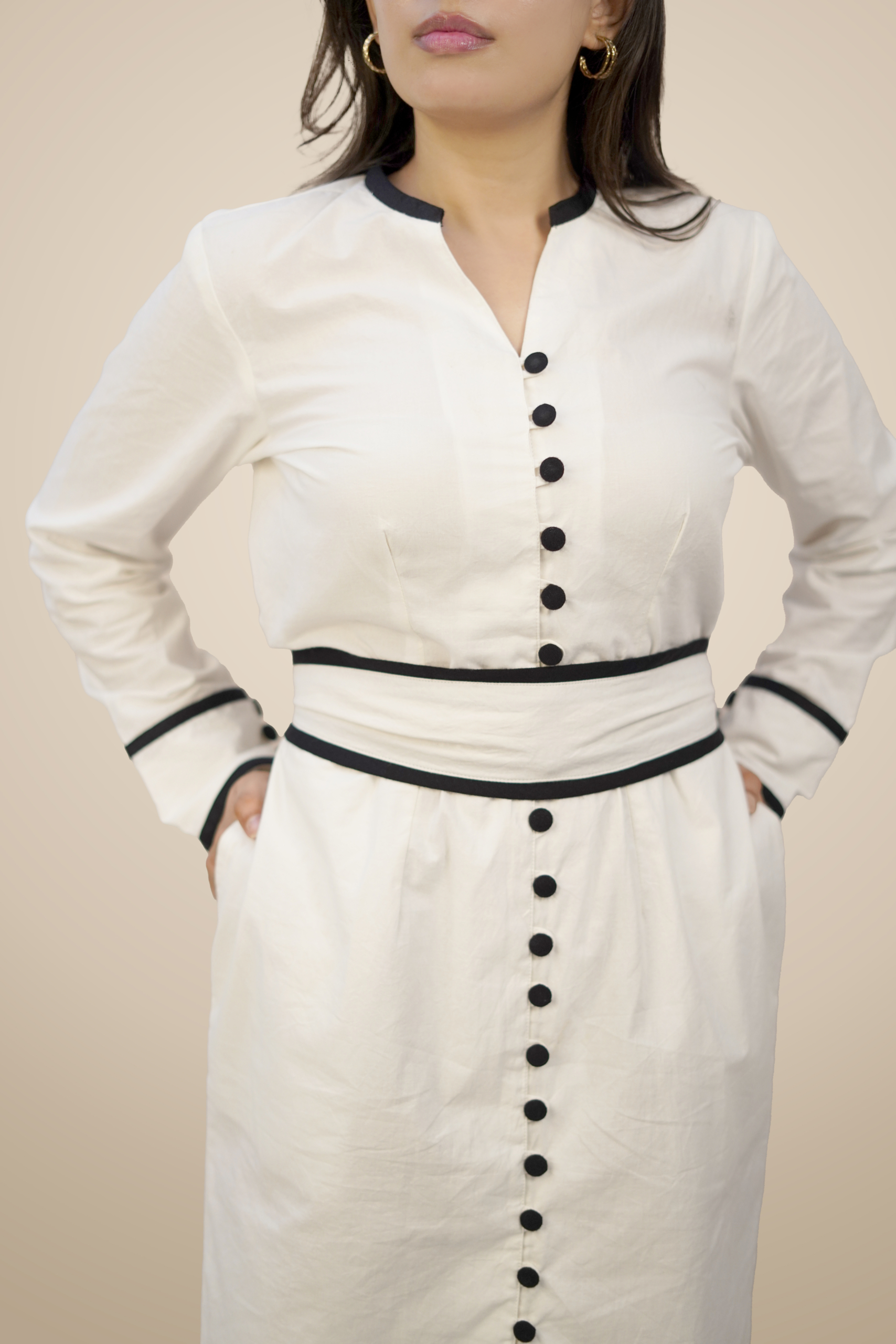 Featuring a clean, structured neckline and a row of statement buttons that run down the front, the design draws the eye vertically, creating a flattering, elongated look. The gently cinched waist enhances the form without feeling restrictive, while the midi length offers a graceful balance between sophistication and ease. Full sleeves with contrast edging add a tailored touch, making the dress equally suited for professional settings and elevated everyday wear.