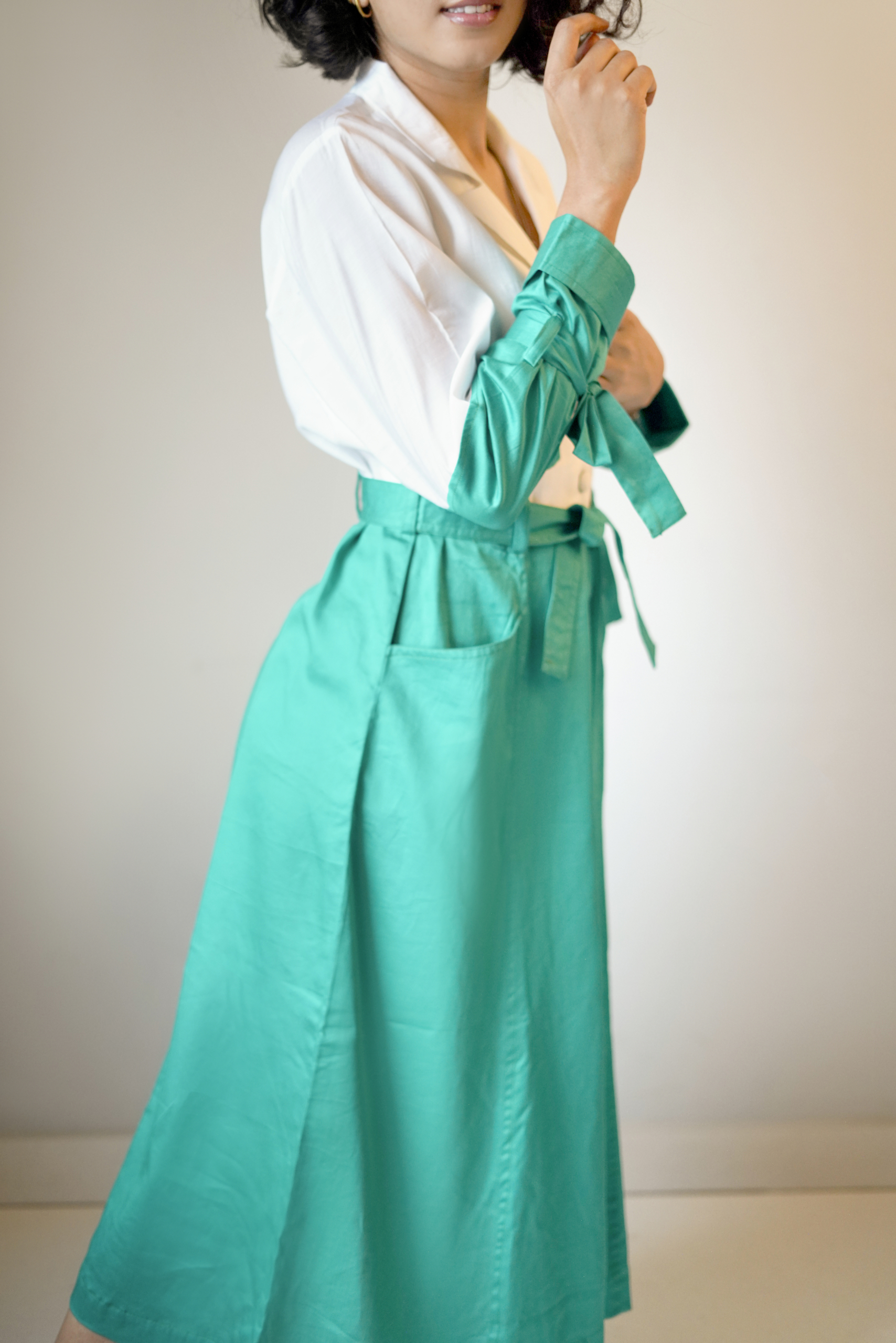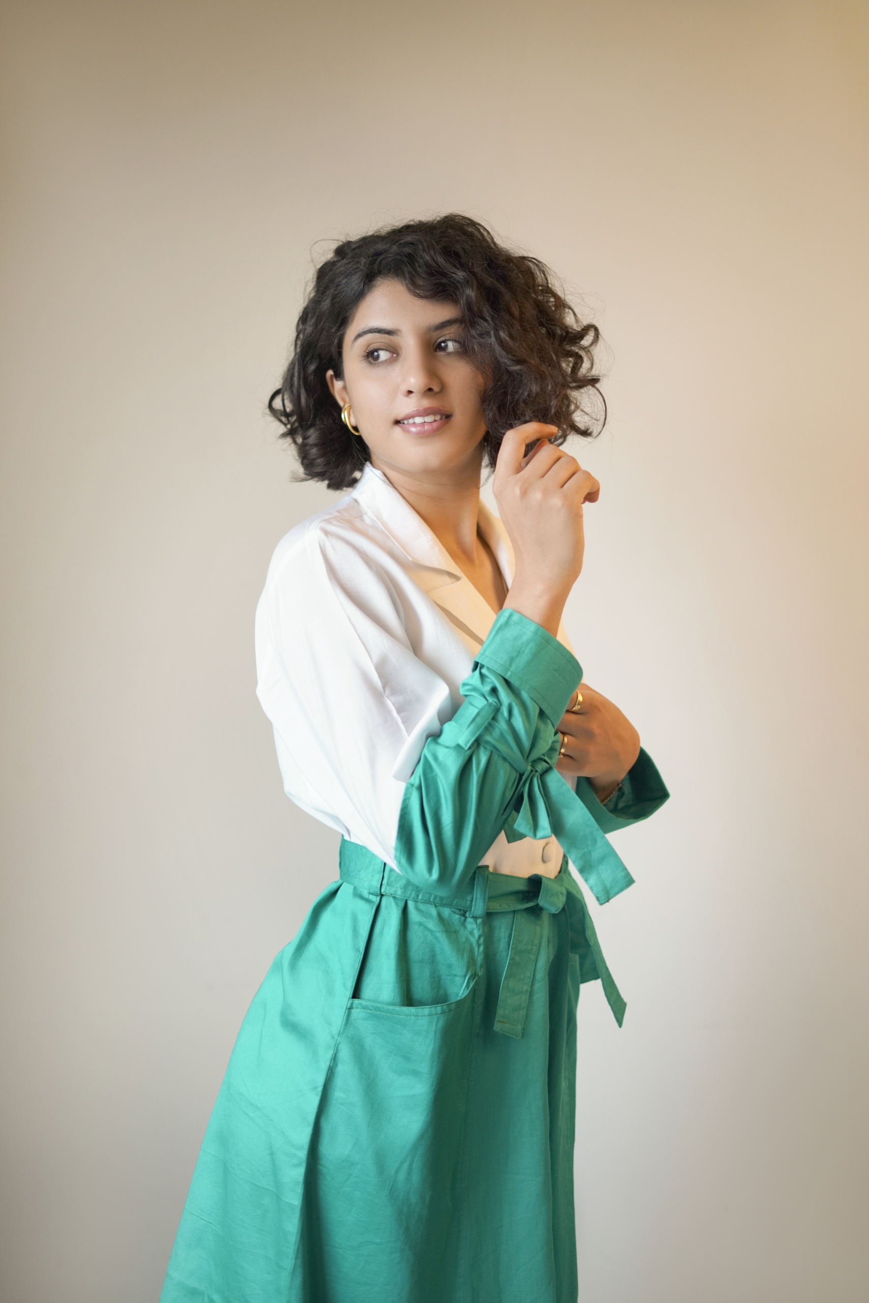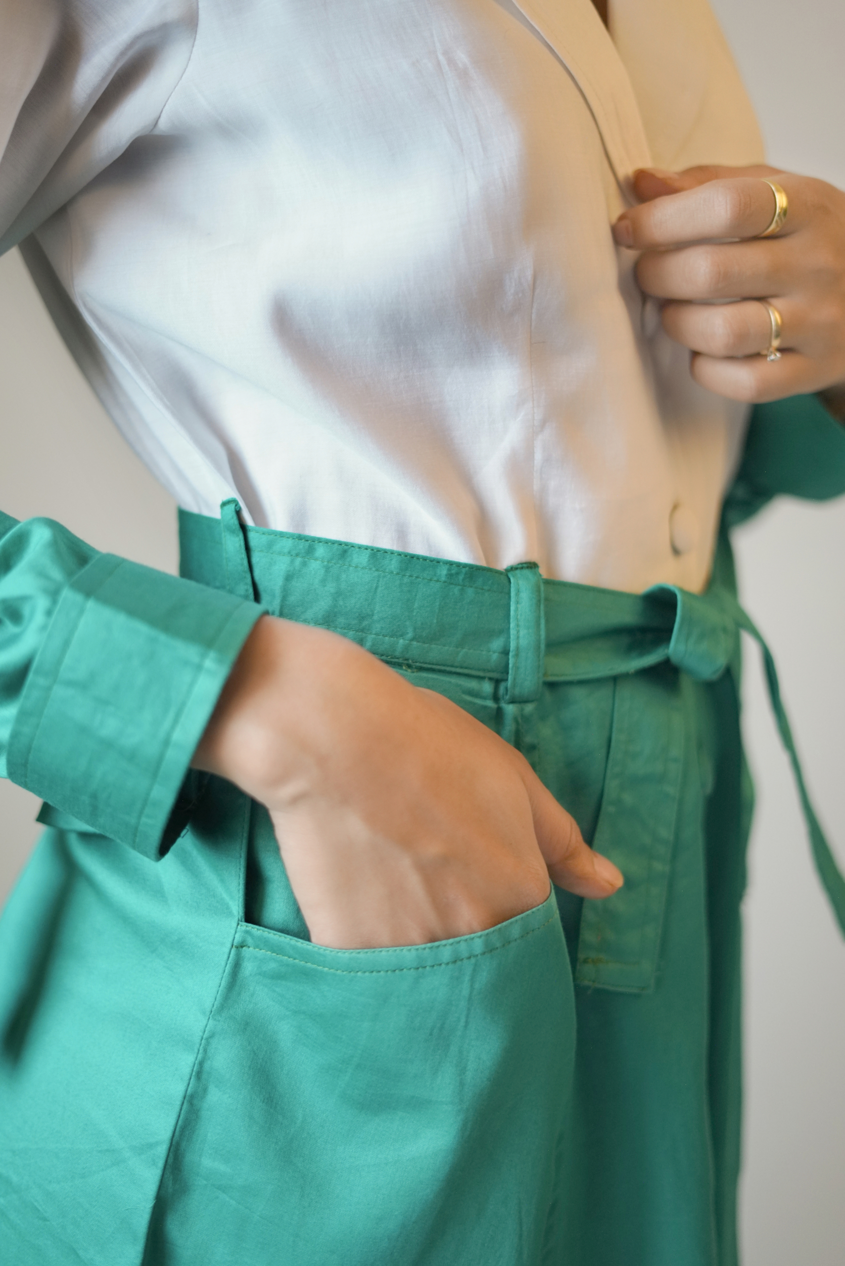 Striking the perfect harmony between structure and fluidity, the Emerald Balance Co-ord Set is designed for effortless modern elegance. This two-piece ensemble features a crisp collared shirt in soft ivory, contrasted beautifully with a rich emerald-green skirt. Thoughtful detailing like the cuff ties, front buttons, and adjustable waist belt add a refined yet relaxed touch, making the silhouette both flattering and functional.