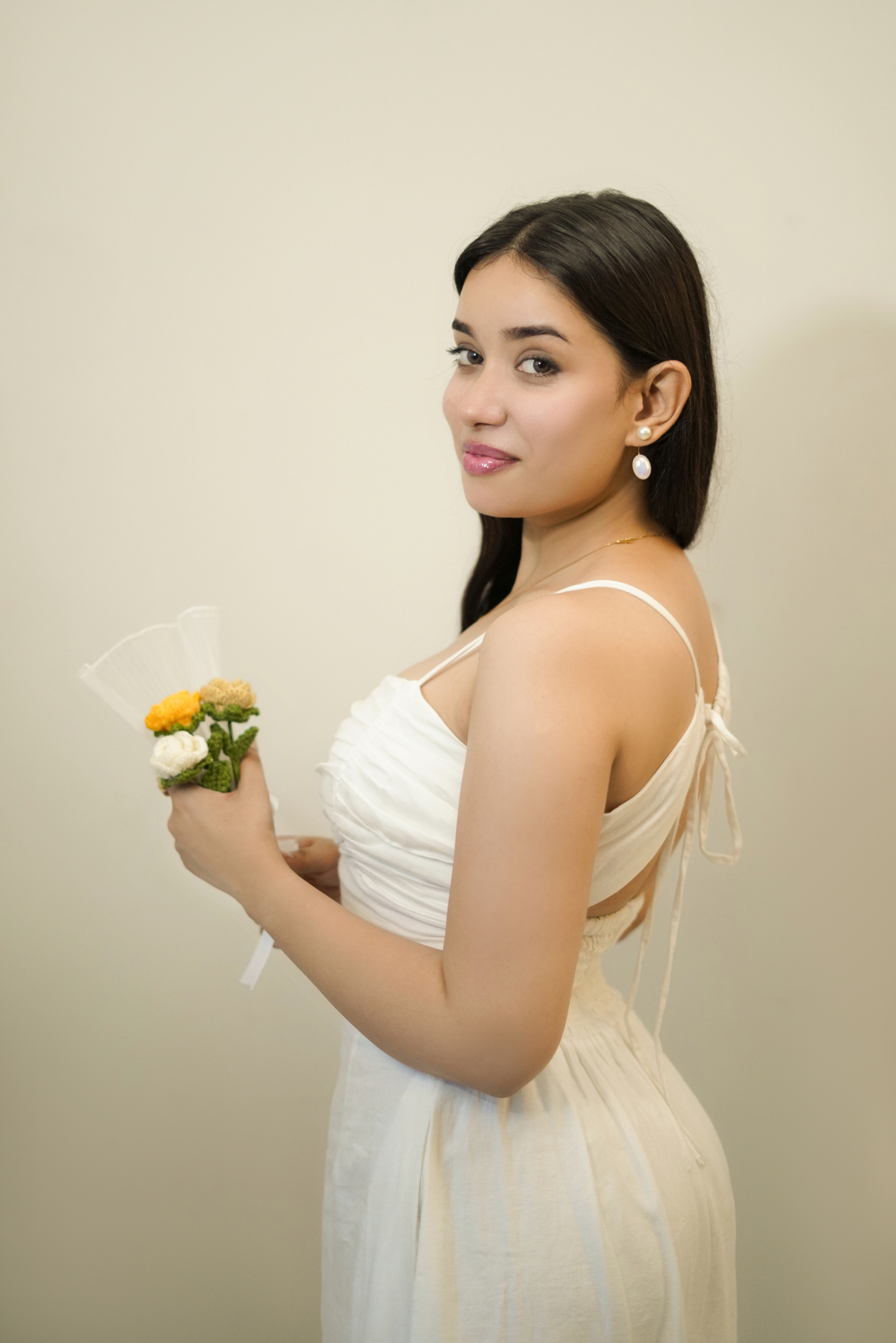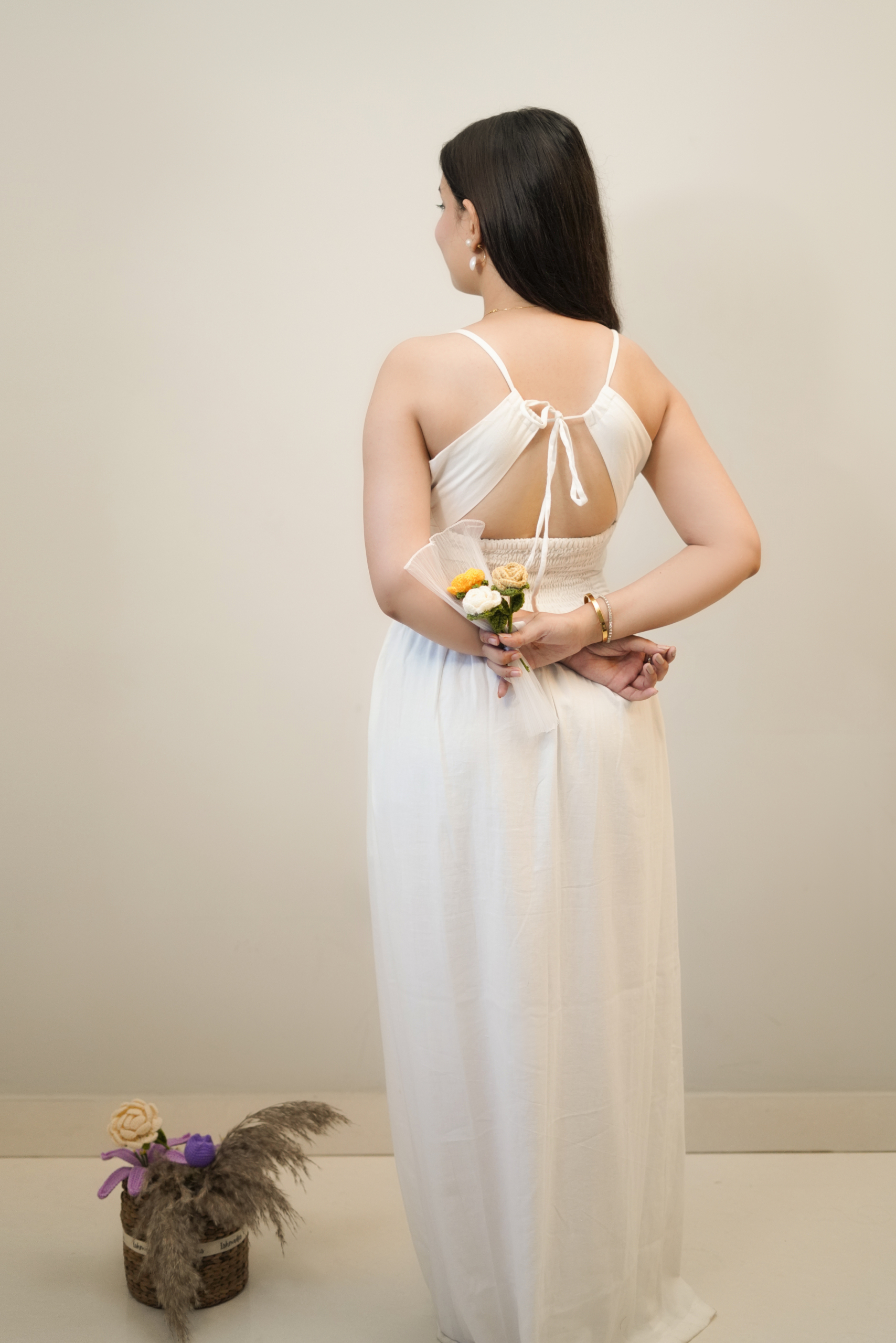 A subtle front slit adds ease of movement and a touch of modern allure, making it perfect for intimate celebrations, sunset dinners, or serene daytime gatherings. Light, breathable, and timeless in appeal, the Ivory Whisper Maxi Dress pairs seamlessly with minimal heels and delicate jewelry for a look that feels calm, refined, and quietly captivating.
