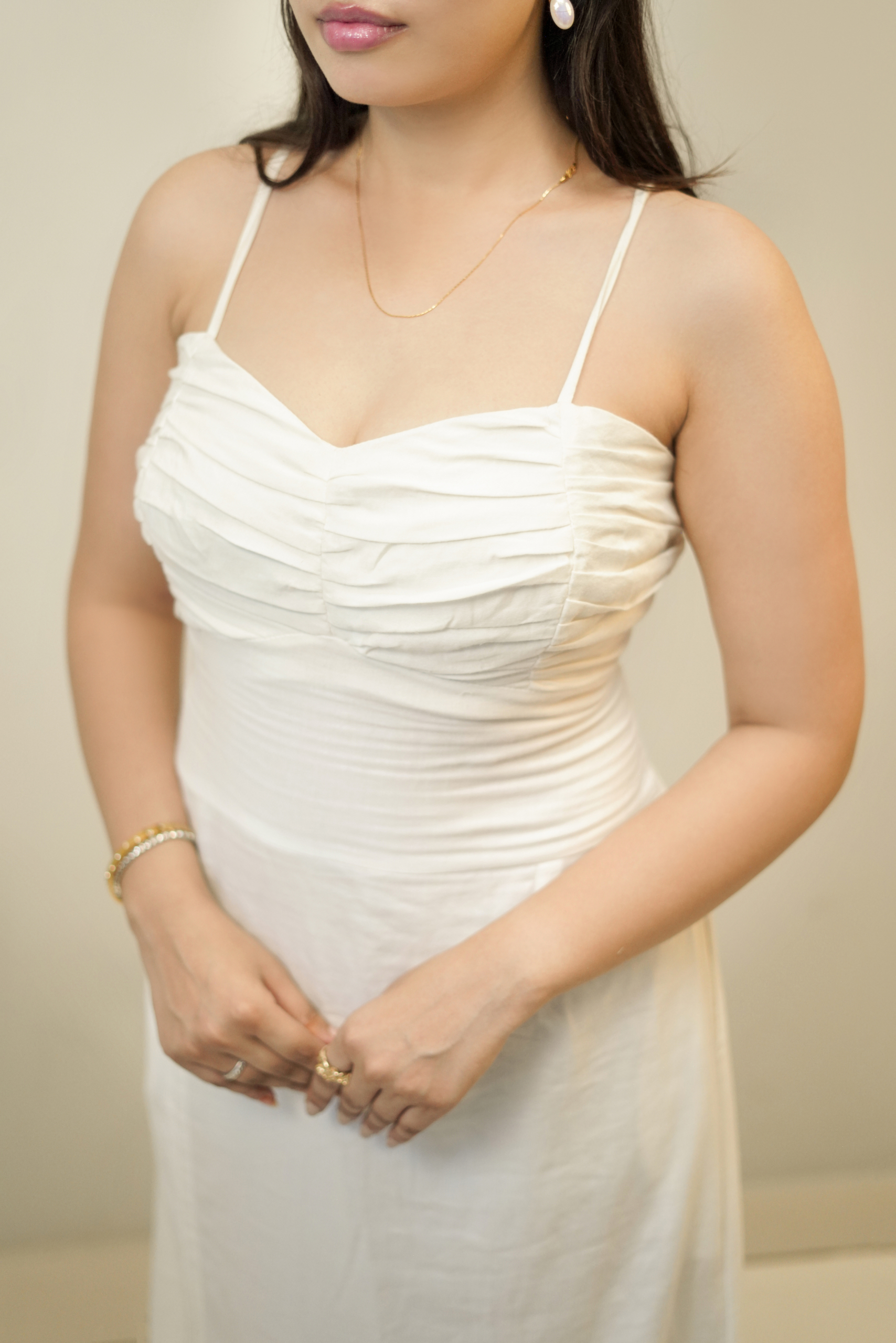Ivory Whisper Maxi Dress embodies soft elegance and understated romance. Designed in a pristine ivory tone, this maxi dress features delicate spaghetti straps and a beautifully ruched bodice that gently contours the silhouette while offering a flattering, feminine fit. The smooth, flowing fabric falls gracefully to the floor, creating an effortlessly elongated look.
