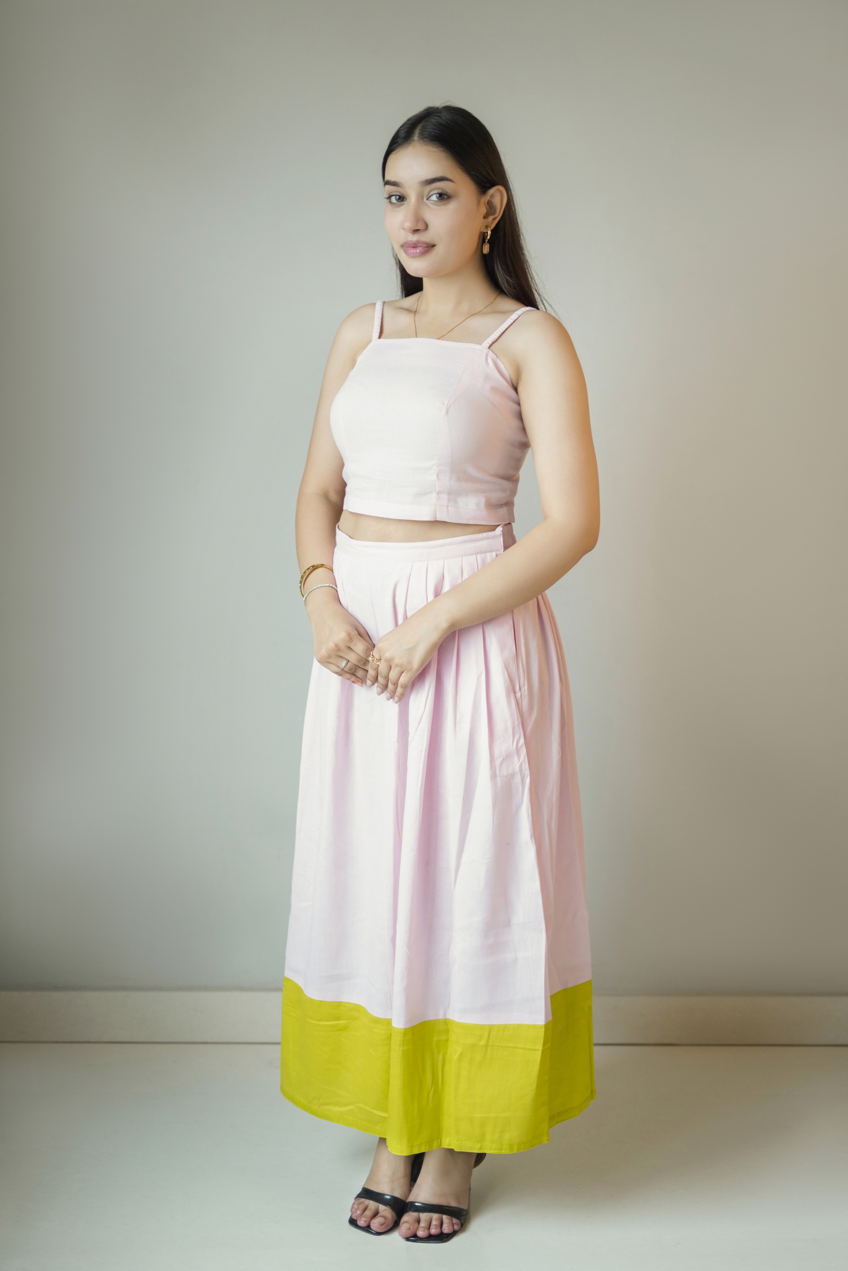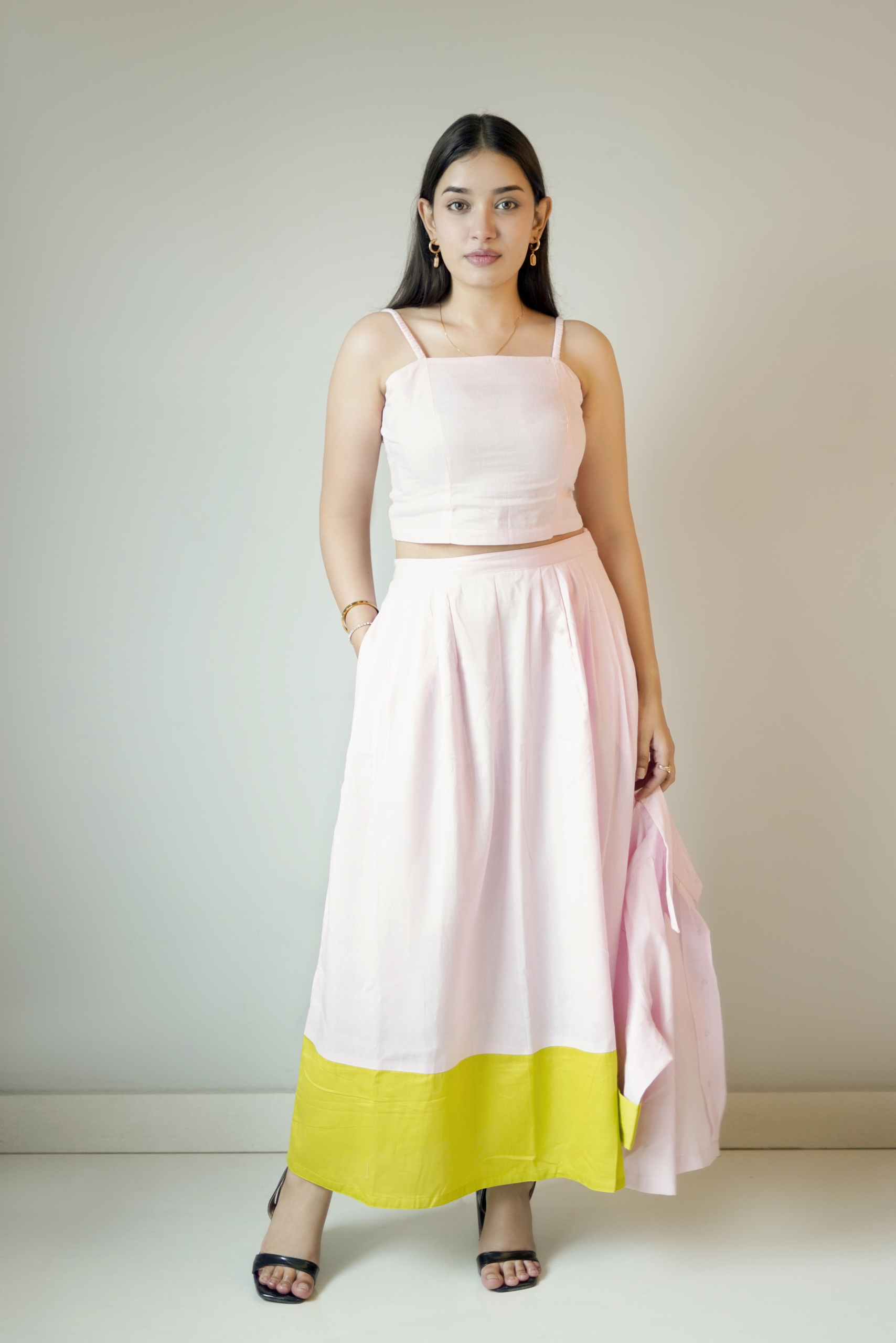 Bright, breezy, and beautifully layered — the Pastel Pop 3-Piece Set is designed to bring effortless elegance to everyday dressing. This coordinated trio includes a structured sleeveless crop top, a flowy high-waist skirt, and a relaxed open jacket, all in a soft pastel pink that feels light and feminine.