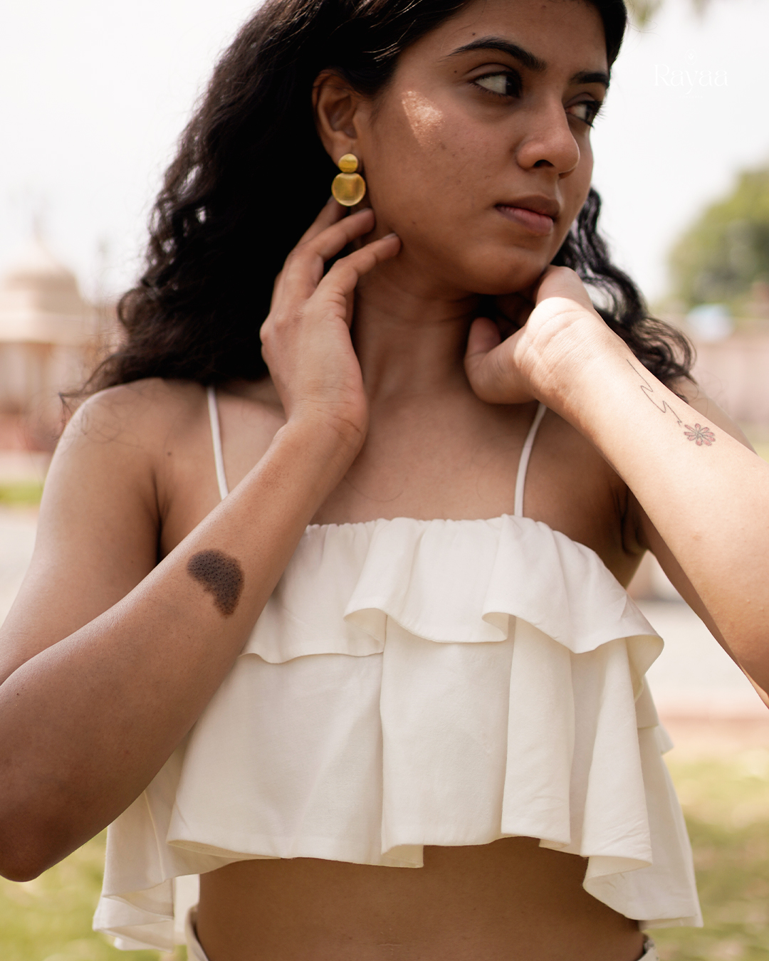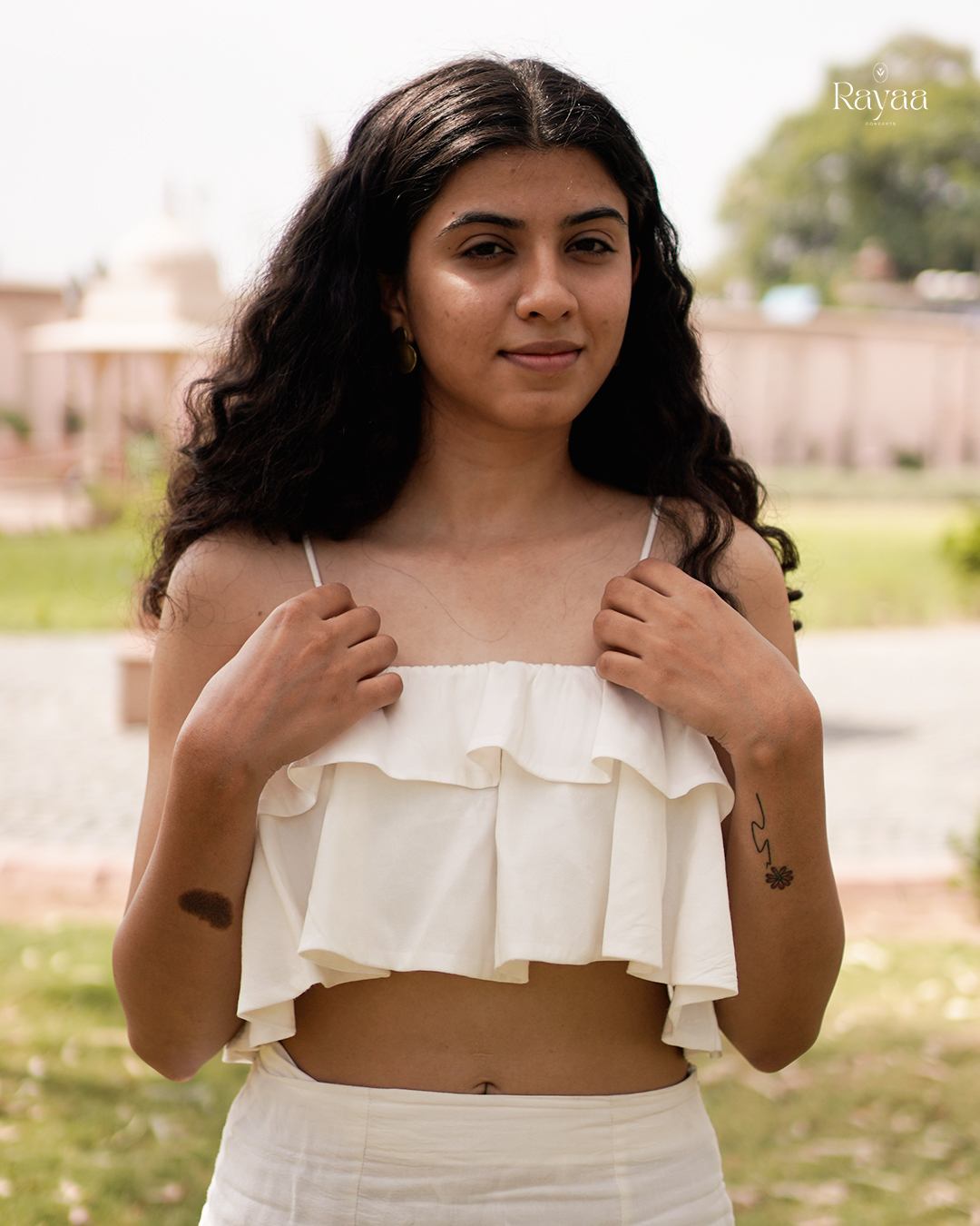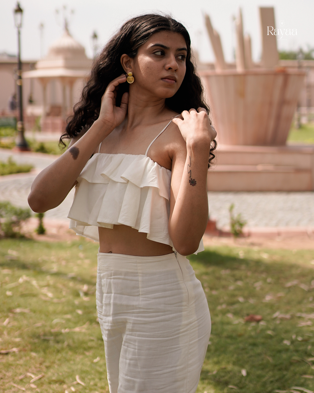 Introducing the “Voyella” white crop top, a chic and stylish addition to your wardrobe. This trendy piece features frill and noodle straps, offering a fashionable front wear look. Perfect for pairing with shorts or denims, it ensures a stylish appearance for any occasion. Crafted from high-quality material with two elegant frills and lined beneath for added comfort. In Picture size M/10, with a length of 14 inches, it’s designed for both style and ease.