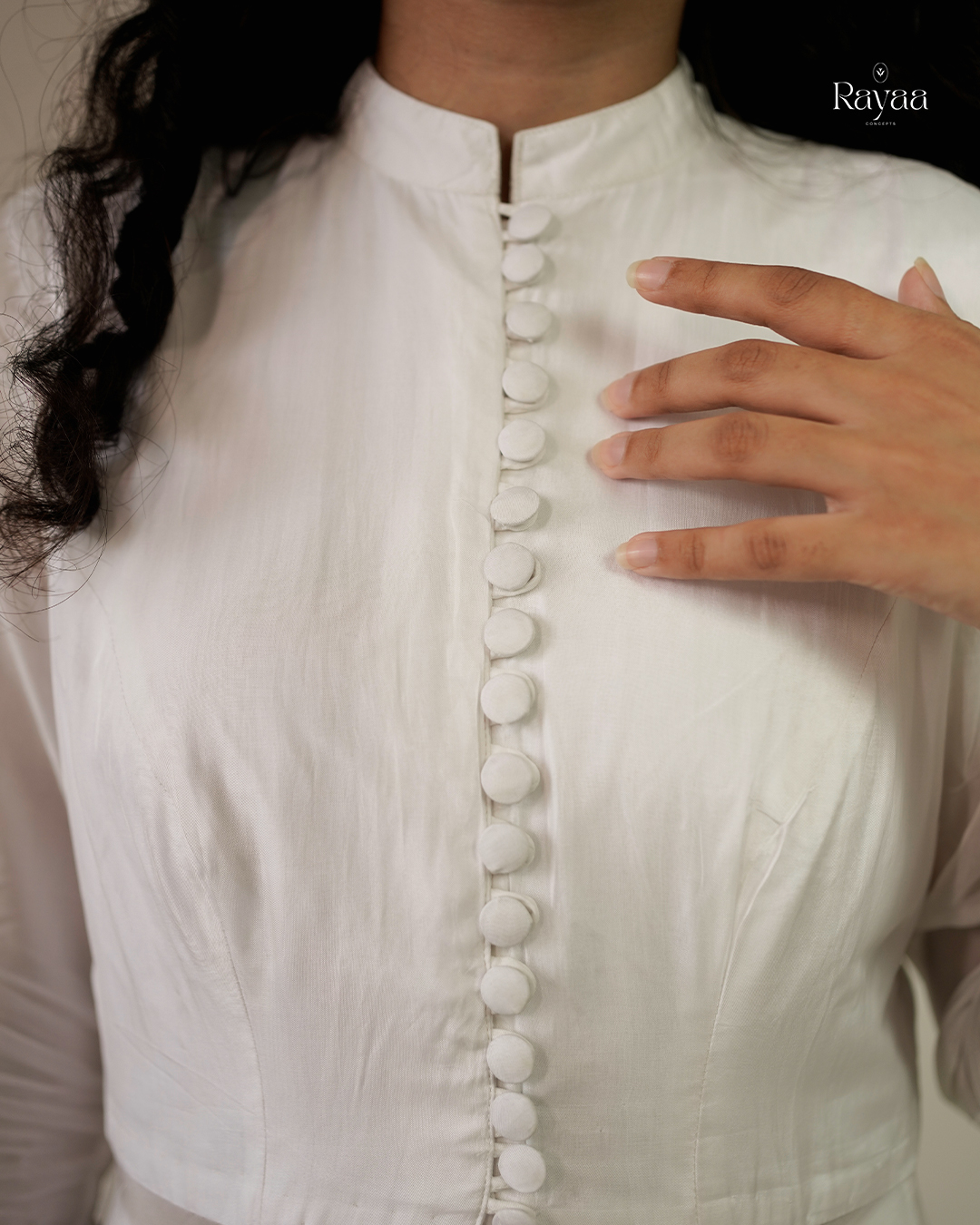 Introducing our elegant Transparent and Opaque Mix Full-Body Length Top, designed to blend sophistication and modern style seamlessly. This stunning top features a unique combination of transparent and opaque cotton, creating a beautiful contrast that adds depth and texture to your look. The front is adorned with a row of elegant buttons, enhancing the overall chic appearance. The classy full sleeves are made from transparent cotton, offering a delicate and airy feel while maintaining an elegant silhouette. This top is perfect for those who appreciate refined fashion with a contemporary twist, making it suitable for various occasions, from formal gatherings to stylish outings.